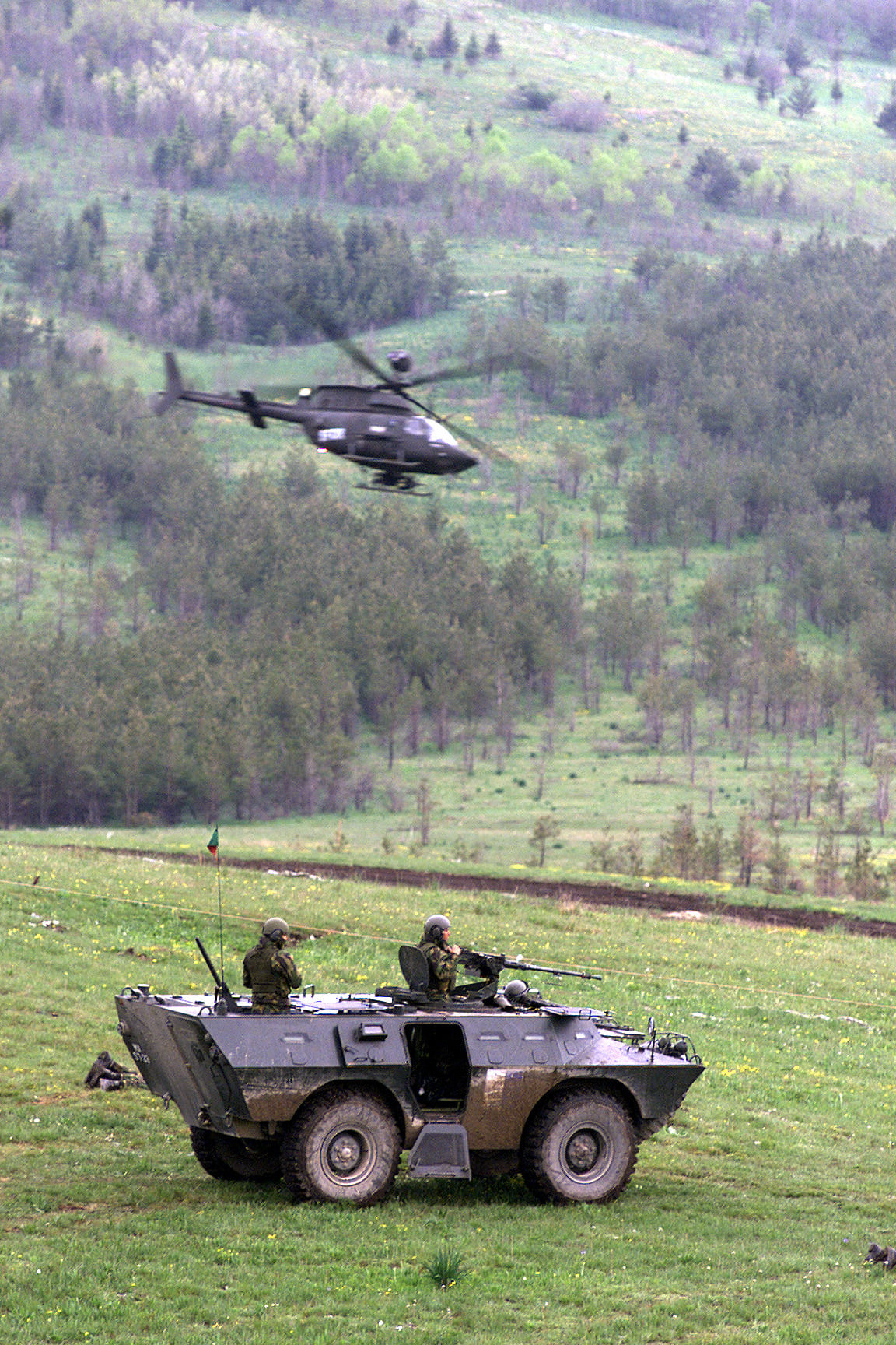 21 a 25 de Maio de 2002Uma viatura blindada Chaimite V-200, do Exército Português (2º BIMec / BMI), fabricada pela BRAVIA (Sociedade Luso-Brasileira de Veículos e Equipamentos, SARL), e equipada com metralhadora pesada Browning de calibre .50, surge aqui, na Bósnia-Herzegovina, acompanhada por um helicóptero do Exército dos EUA, Bell OH-58D Kiowa Warrior ("1st Battalion, 25th Aviation regiment" [1-25 ARB], então a operar a partir da base aérea de Tuzla, "Eagle", a cerca de 80 Km a Norte de Sarajevo). Estão, envolvidos com mais viaturas e mais um "Kiowa", em exercícios conjuntos de fogo real, contra alvos até 2 Km de distância, no campo de tiro de Glamoč, a 120 Km a Oeste de Sarajevo (mais de 200 Km por estrada), no âmbito dos exercícios "Iberian Resolve" em 2002.